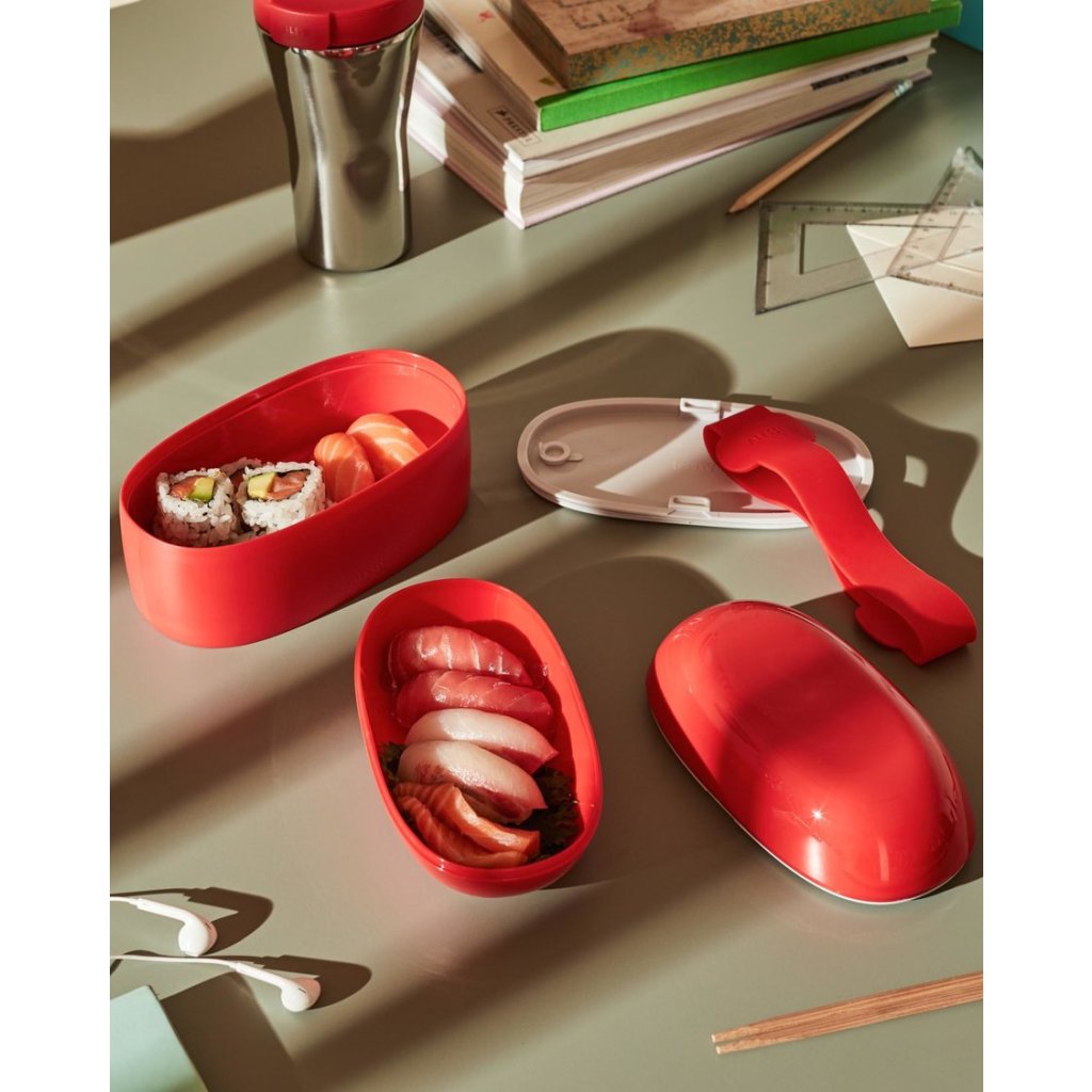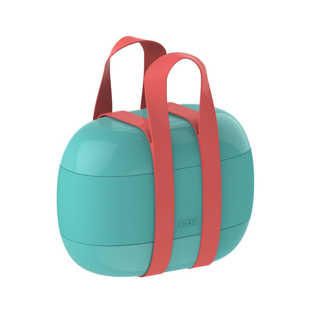 Food à porter to pojemnik na lunch, który nie wygląda jak pojemnik na lunch, ale raczej jak wyrafinowany dodatek modowy. Daleki od anonimowego designu tradycyjnych pojemników na żywność, Alessi prezentuje przestronne, kompaktowe i wszechstronne pudełko na przekąski/lunch, podzielone na dwie komory z poręczną wielofunkcyjną pokrywą wewnętrzną. Idealny dla tych, którzy chcą cieszyć się jedzeniem przygotowanym w domu lub dla tych, którzy przestrzegają określonej diety.