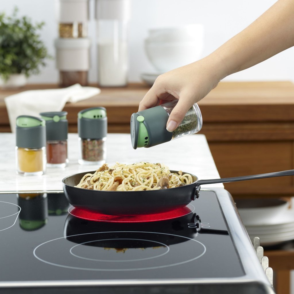 - Po użyciu wystarczy zatrzasnąć pokrywę z powrotem w pozycji zamkniętej, aby chronić przyprawy i utrzymać porządek.