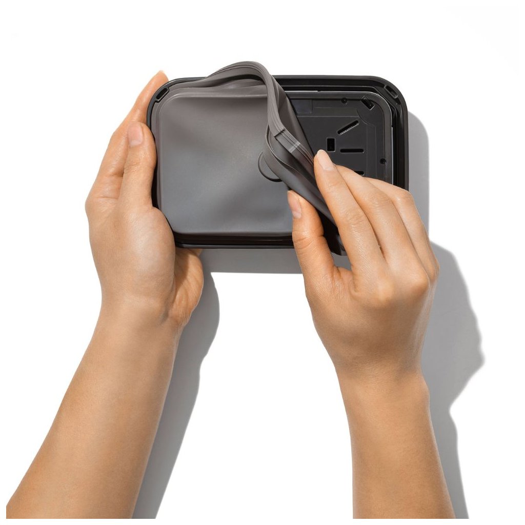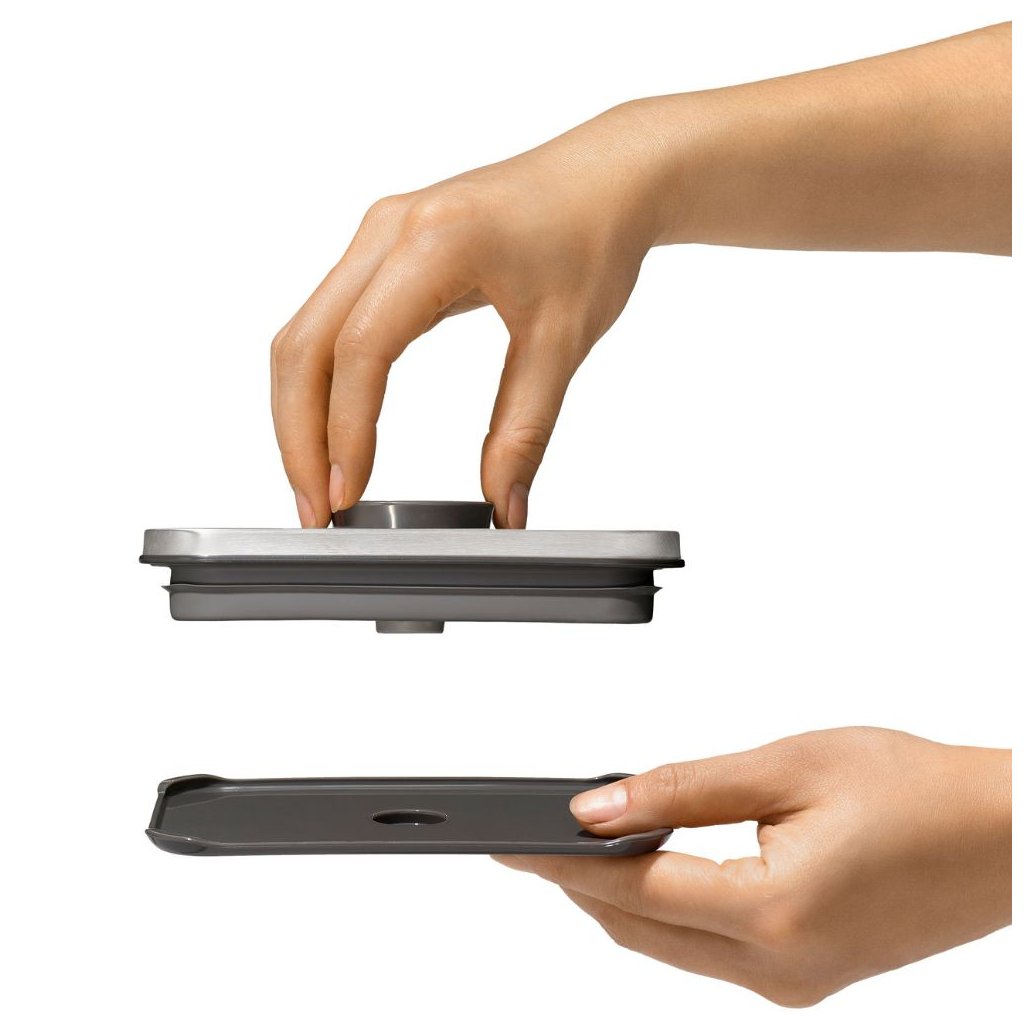 - opcjonalne akcesoria OXO, np. miarkę, można umieścić na spodzie pokrywy ze stali nierdzewnej