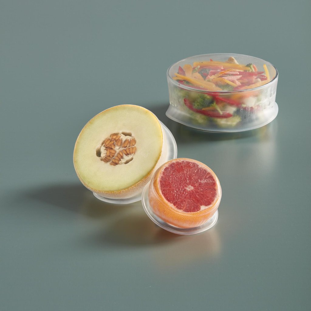 - Wielokrotnego użytku silikonowa pokrywka Lékué o średnicy 15 cm jest stosowana do konserwacji żywności jako praktyczny zamiennik opakowań jednorazowych.