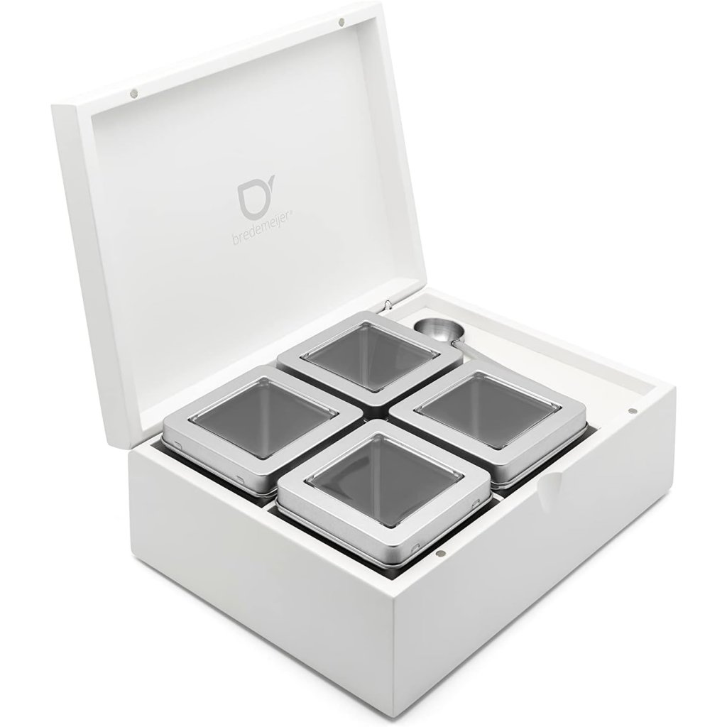 - zawiera 4 zamykane słoiki z przezroczystym okienkiem na różne rodzaje herbaty