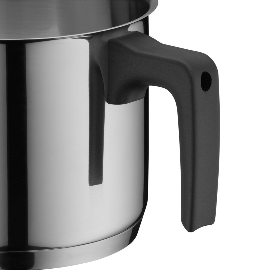 Rondel dzbanek na mleko WMF o średnicy 14 cm wykonany jest z polerowanej stali nierdzewnej Cromargan® z uchwytem z tworzywa sztucznego. Nadaje się do podgrzewania i gotowania delikatnych potraw, takich jak mleko lub sosy śmietanowe. Uniwersalne dno TransTherm® szybko rozprowadza ciepło i jest odpowiednie do wszystkich rodzajów kuchenek, w tym indukcyjnych. Rondel jest łatwy do czyszczenia, można go również myć w zmywarce.