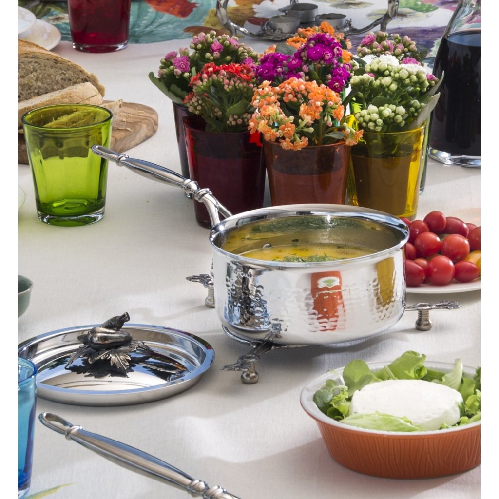 - solidna pokrywa ze stali nierdzewnej z uchwytem w pięknym dekorze, który jest ręcznie odlewany z litego brązu i posrebrzany
