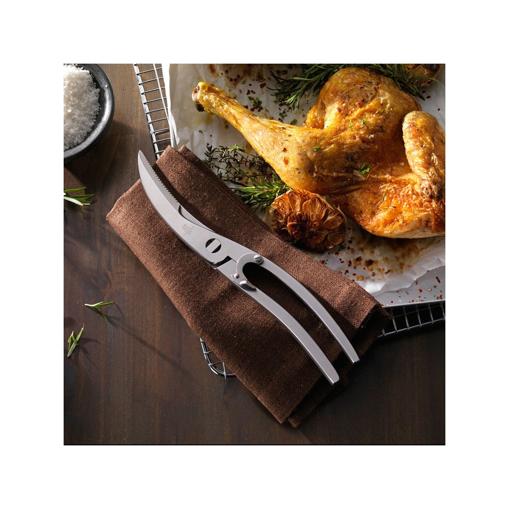 Nożyce do drobiu firmy ZWIL LING J. A. Henckels wykonane z wysokiej jakości stali nierdzewnej są wytrzymałe, wyjątkowo niezawodne, zapewniają optymalne przenoszenie siły podczas porcjowania drobiu. Rozdrabniacz do kości i ząbkowane ostrze zapewniają łatwe i czyste porcjowanie drobiu.