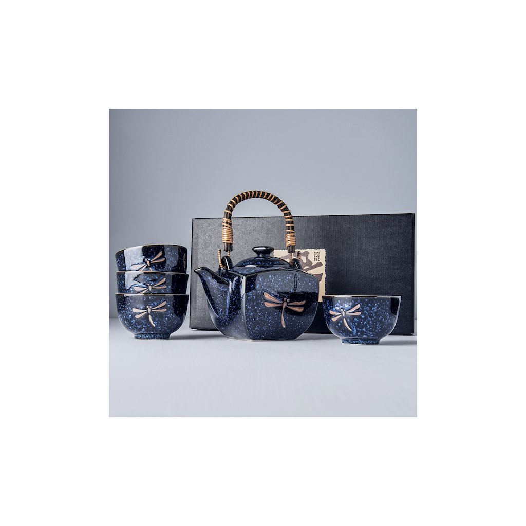 W skład zestawu wchodzi 1 dzbanek do herbaty o pojemności 750 ml oraz 4 miseczki do herbaty o pojemności 180 ml. Zestaw ma charakterystyczny niebieski kolor z brązowym motywem ważki. Zestaw dostarczany jest w czarnym pudełkui dlatego nadaje się na prezent.