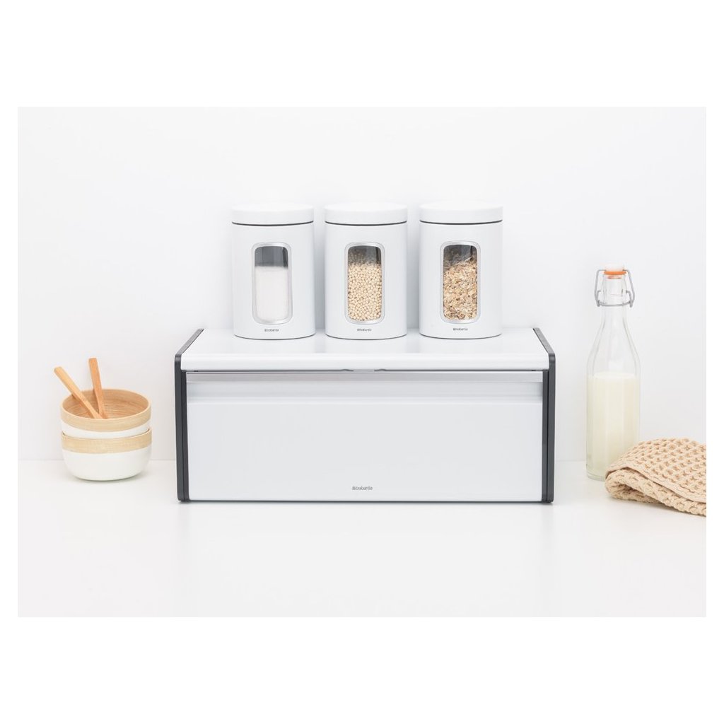 Szukasz rozwiązania pozwalającego zaoszczędzić miejsce i utrzymać świeżość lub chrupkość pieczywa? Poznaj chlebak Fall Front od producenta Brabantia. Mieści do dwóch bochenków, ale nie potrzebuje dużo miejsca dzięki prostokątnemu designowi. Chlebak Fall Front ma płaską górę, co pozwala na umieszczenie dodatkowych pojemników. Dodatkowo, dzięki magnetycznemu zamknięciu, utrzymuje świeżość pieczywa. A jeśli nie masz miejsca na blacie kuchennym, z pewnością docenisz możliwość powieszenia go na ścianie dzięki pętlom do zawieszania znajdującym się z tyłu chlebaka.