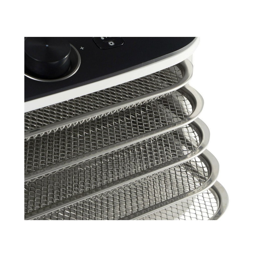 Suszarka solarna Yden CI IR D5 wyposażona jest w 5 bardzo trwałych i higienicznych tac do suszenia ze stali nierdzewnej, plastikową tackę ociekową oraz opcjonalnie silikonowe wkładki do suszenia roztworów i przecierów. Dzięki systemowi cyrkulacji nie ma konieczności przestawiania tac, aby uzyskać równomierne wysuszenie surowców.