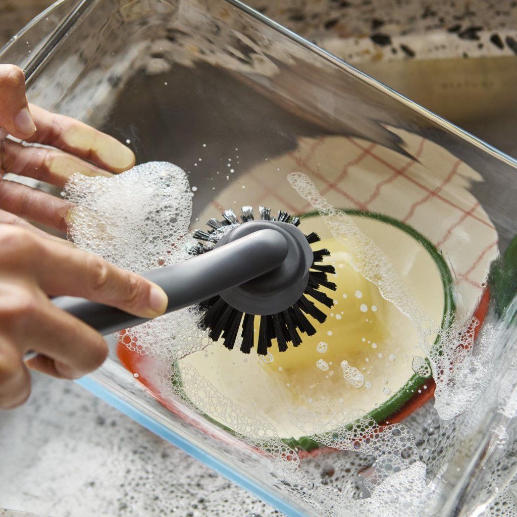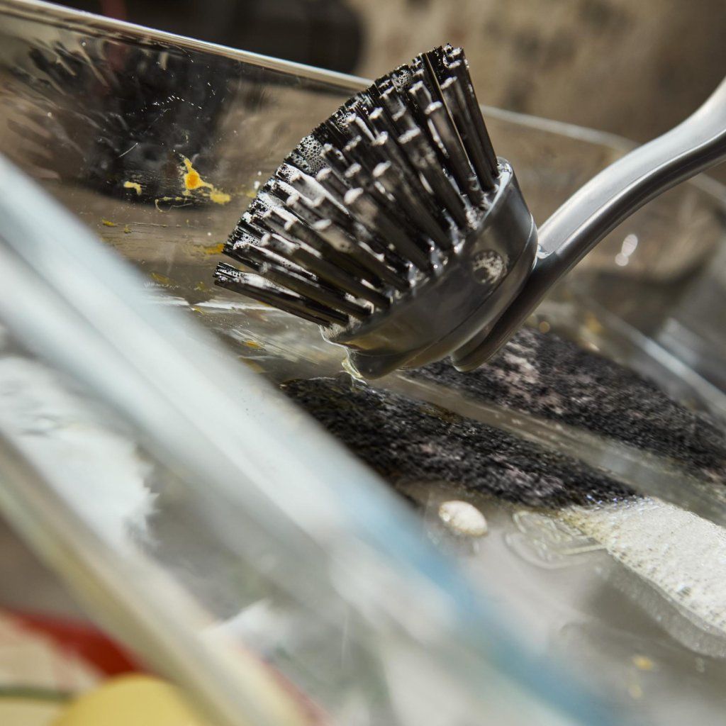 - Wytrzymałe włosie, zaprojektowane tak, by nie przebarwiać się, zachowuje czysty wygląd nawet przy częstym użytkowaniu i skutecznie usuwa zaschnięte resztki jedzenia z talerzy i garnków.