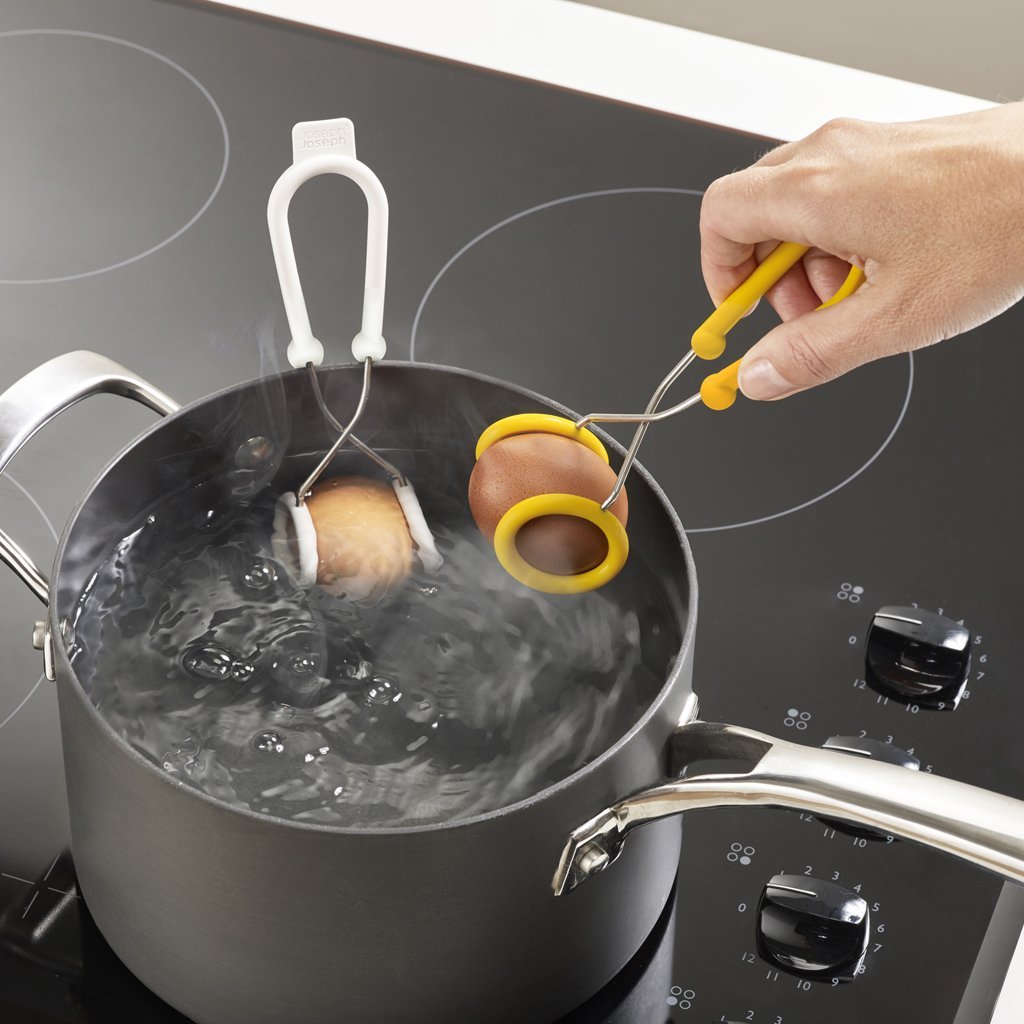 Szczypce JOSEPH JOSEPH O-Tongs są pomocne podczas gotowania jajek. Ułatwiają one manipulowanie jajkiem podczas wkładania i wyjmowania go z garnka. Ich silikonowe uchwyty są odporne na temperaturę do 270 °C. Podczas gotowania możesz pozostawić jajko zaciśnięte w szczypcach zawieszonych na krawędzi garnka. Zapobiegając przemieszczaniu się jajek w garnku, zmniejszasz ryzyko ich stłuczenia. Szczypce są wysyłane w parze, w kolorze białym i żółtym. Różność kolorów jest pomocna, kiedy wybierasz odmienny czas gotowania jajek.