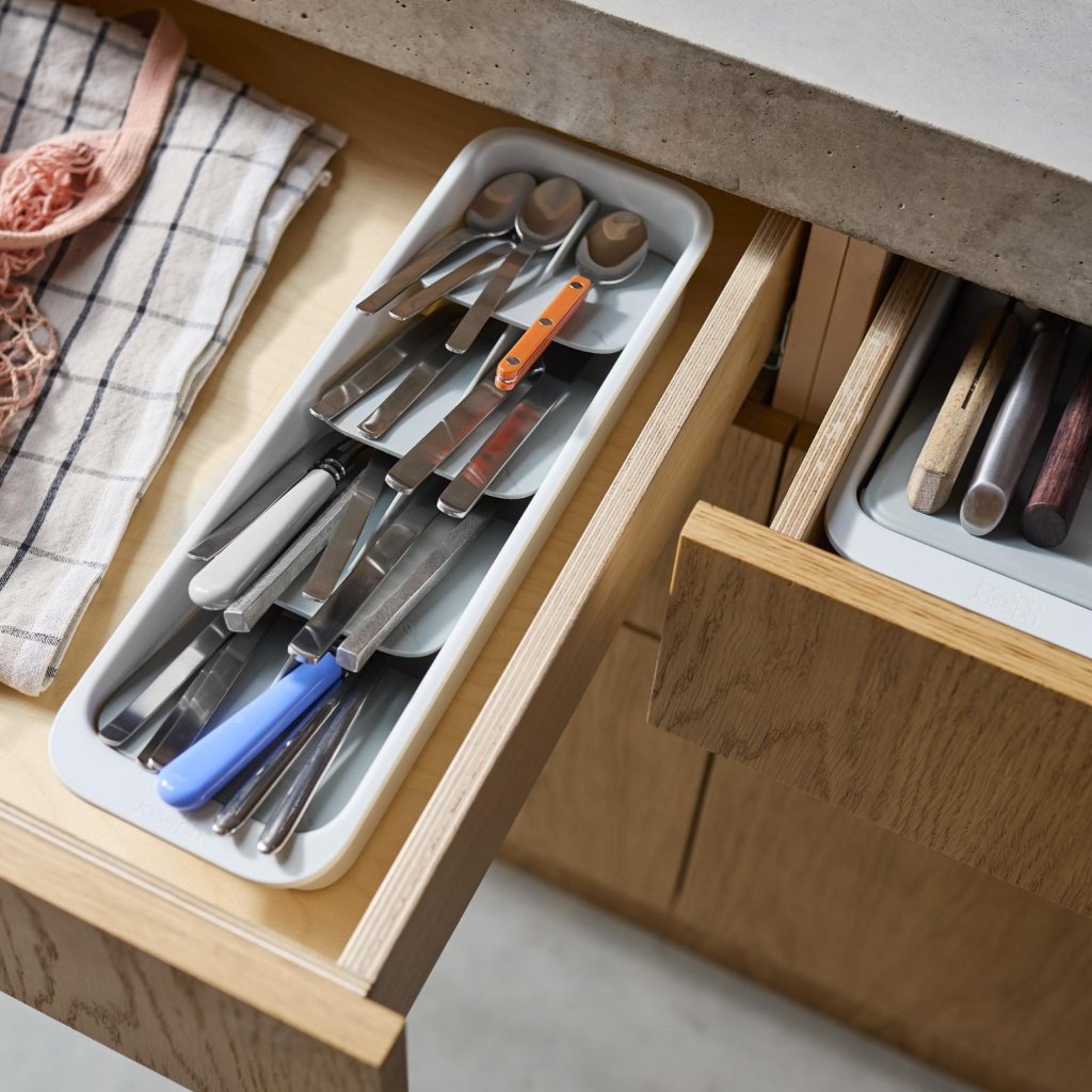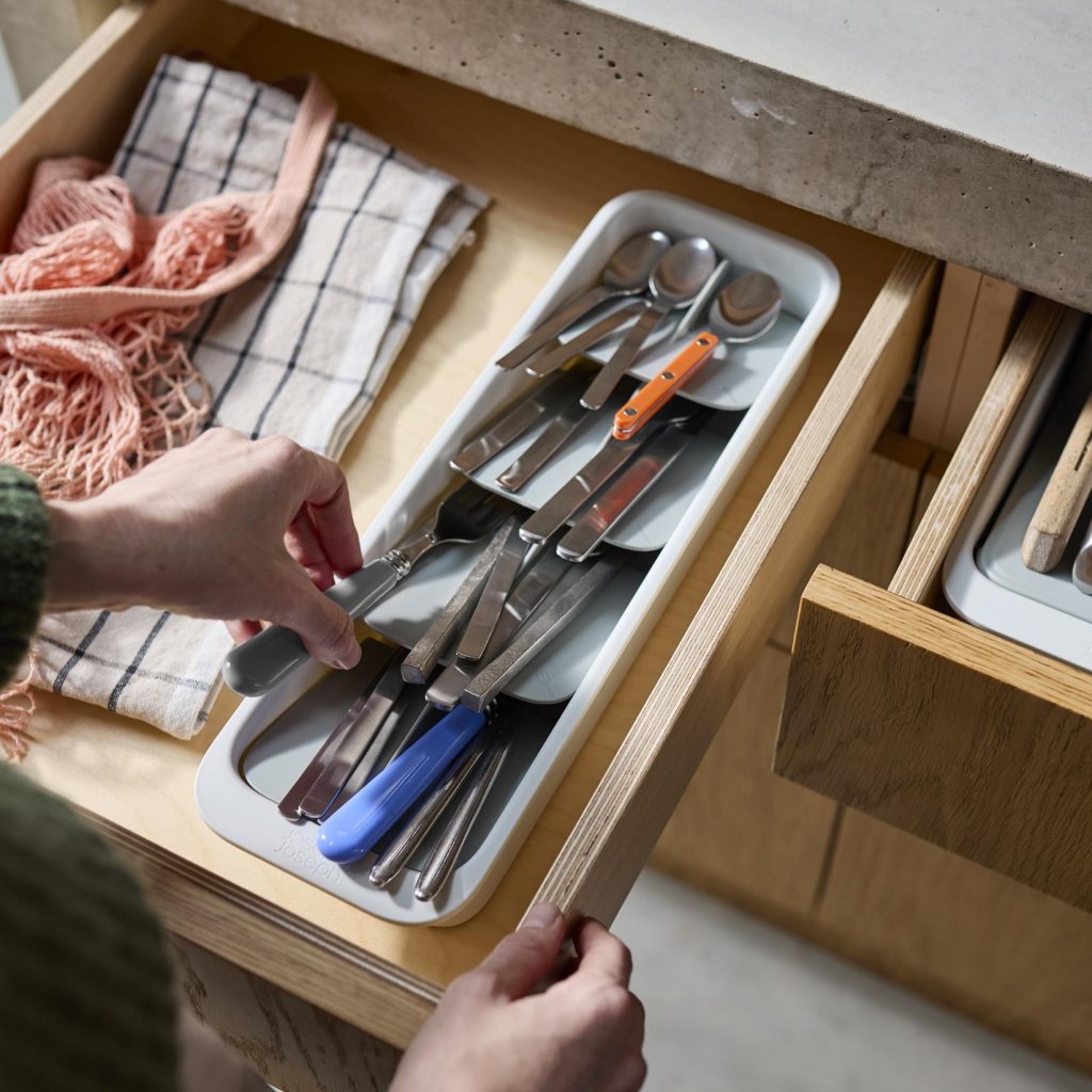 - Kompaktowa taca na sztućce Joseph Joseph DRAWERSTORE pomaga uporządkować sztućce nawet w mniejszych szufladach kuchennych.