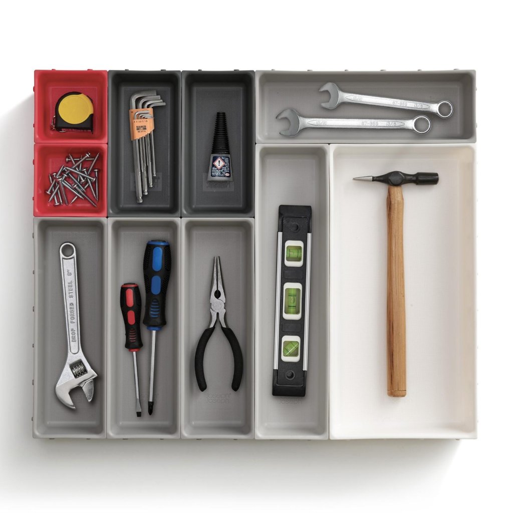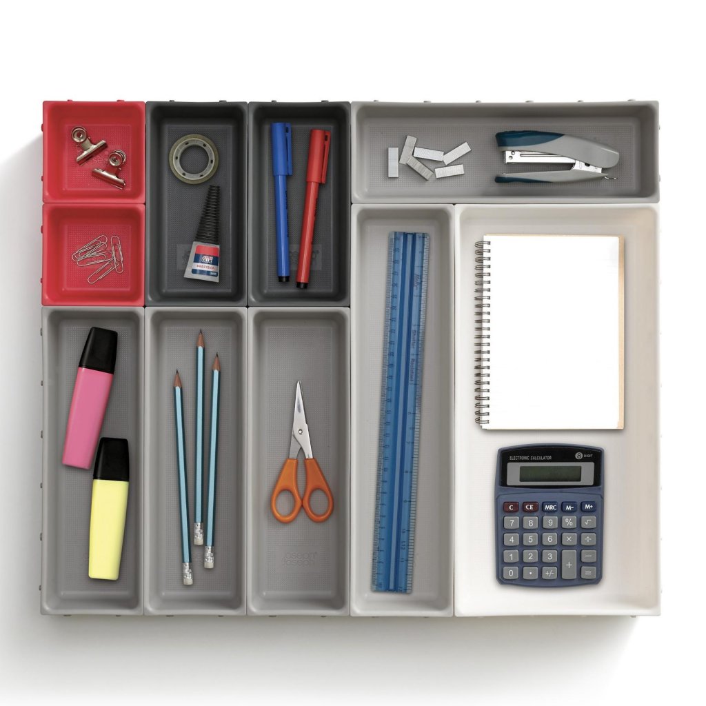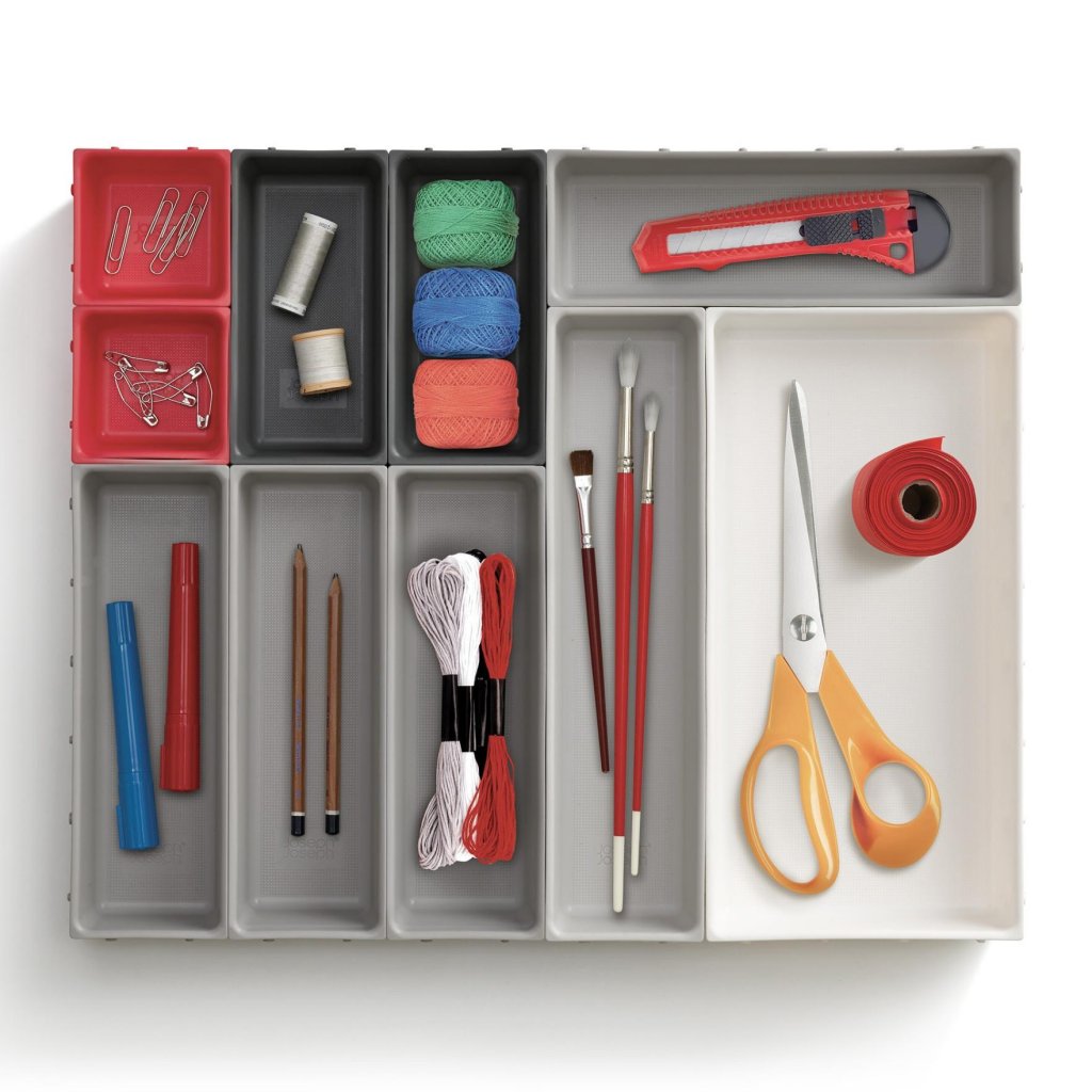 - Zestaw zawiera 10 niezależnych plastikowych pojemników o różnych rozmiarach, które można łączyć dokładnie według wymiarów Twojej szuflady.