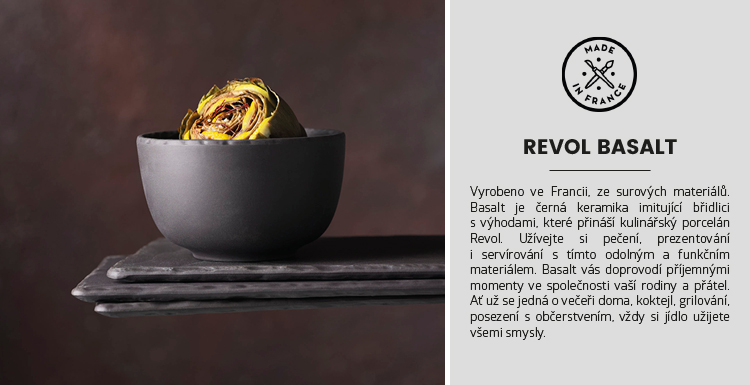 Seria Basalt wykonana jest z wysokiej jakości francuskiej porcelany REVOL, która jest w 100% naturalna i nie zawiera kadmu ani ołowiu. Jest nieporowaty i nie wchłania tłuszczów, bakterii ani zapachów, dzięki czemu gwarantuje higieniczne przygotowywanie posiłków dla Ciebie i Twoich bliskich. Porcelana ta jest odporna na szoki temperaturowe, może być używana w piekarniku (+300°C), kuchence mikrofalowej i zamrażarce oraz nadaje się do mycia w zmywarce.