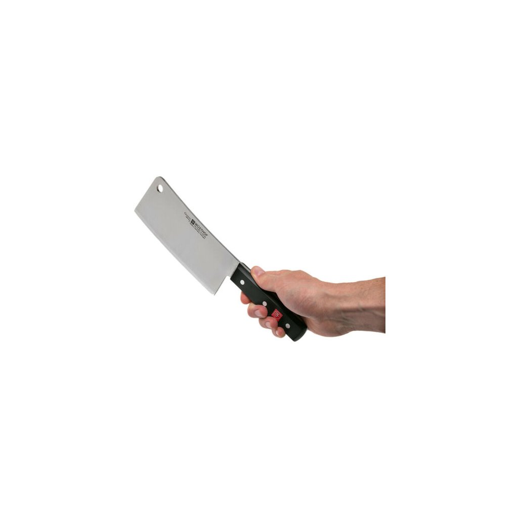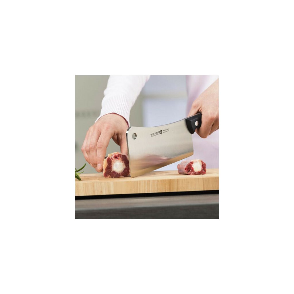 Tasak do mięsa Gourmet porcjuje kawałki mięsa bez wysiłku, nawet z kością. Podczas pracy szczególnie docenisz idealną równowagę pomiędzy ostrzem a rękojeścią, co jest szczególnie ważne przy dłuższej pracy z nożem. Szerokie ostrze jest wystarczająco mocne w górnej części, ale jednocześnie bardzo łatwo przenika przez mięso. Dzięki temu tasakowi rzadko zdarza się, aby nóż utknął w mięsie. Stal nierdzewna jest wysoce odporna na korozję.