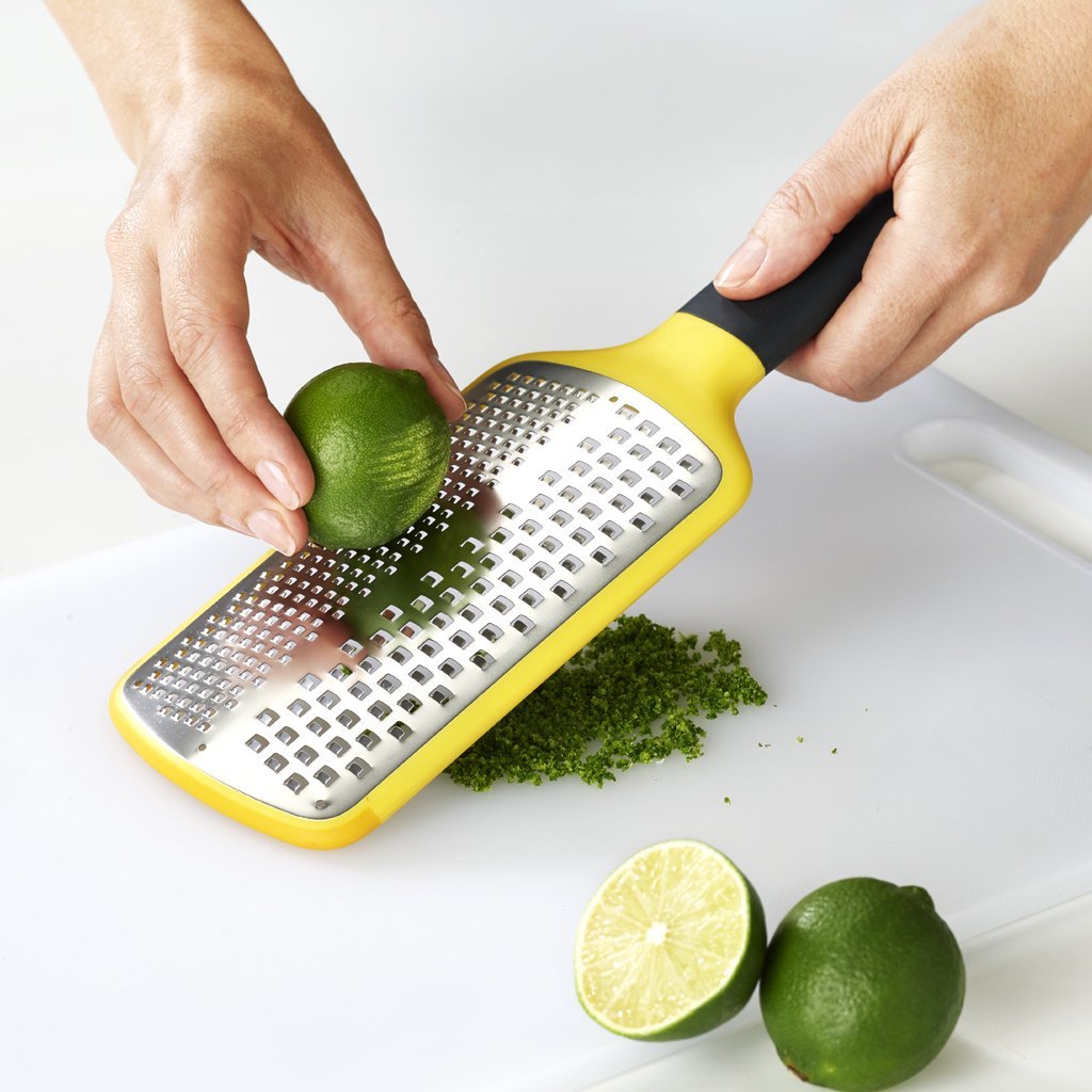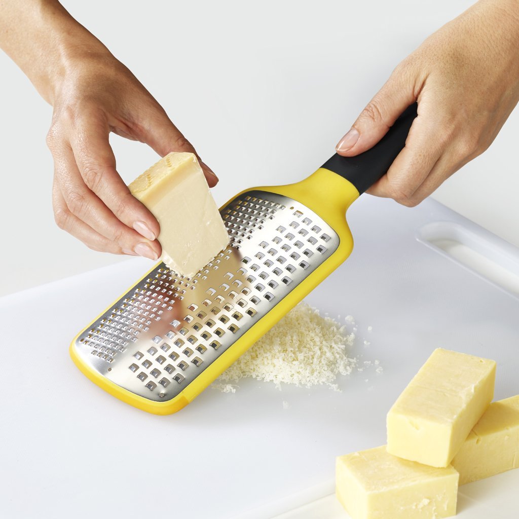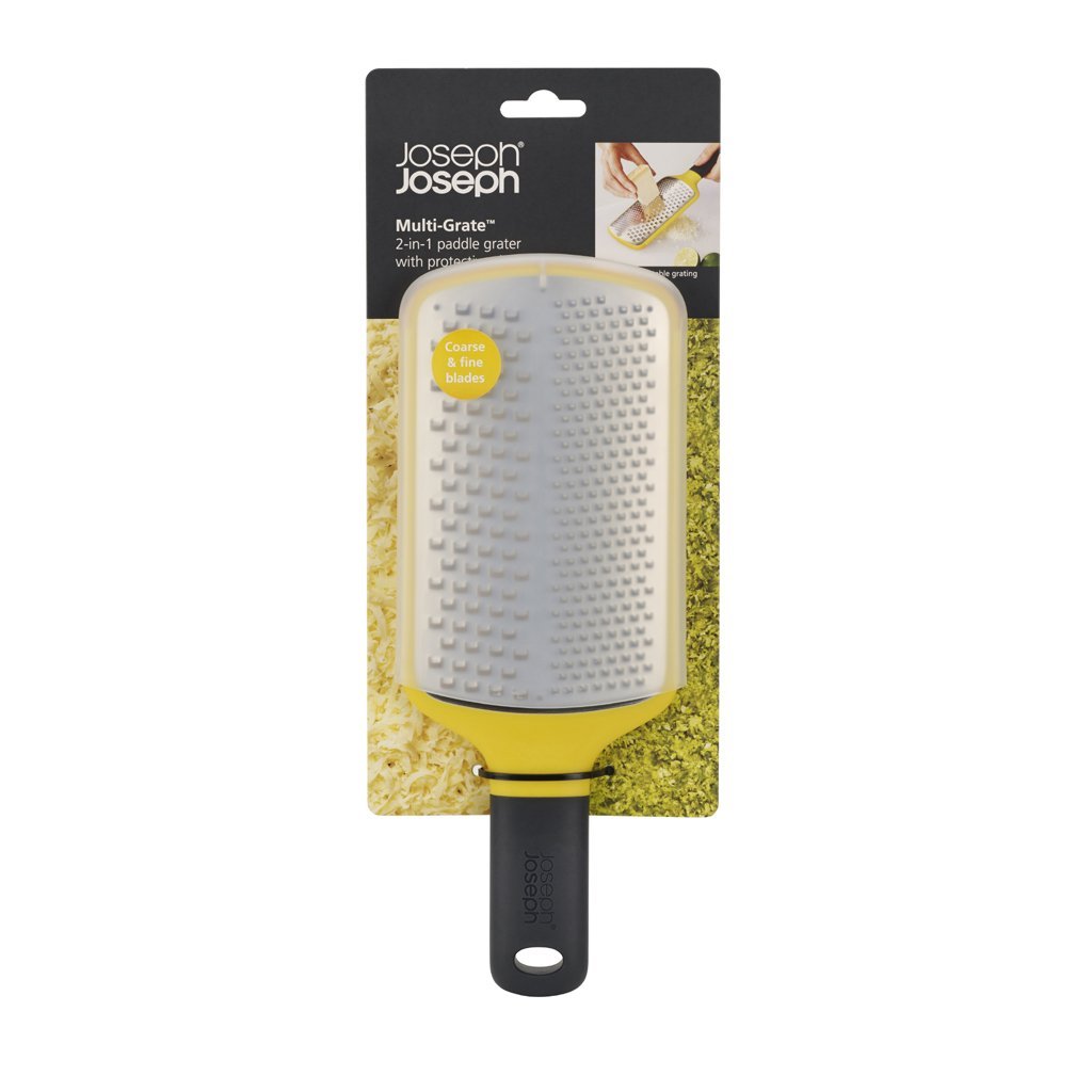 Kompaktowa podwójna tarka JOSEPH JOSEPH Multi-Grate. Gruba tarka do sera i warzyw, drobna do tarcia twardego sera (parmezanu) i skórek cytrusów. Konstrukcja w kształcie wiosła ułatwia tarcie bezpośrednio nad talerzem. Tarkę można myć w zmywarce.