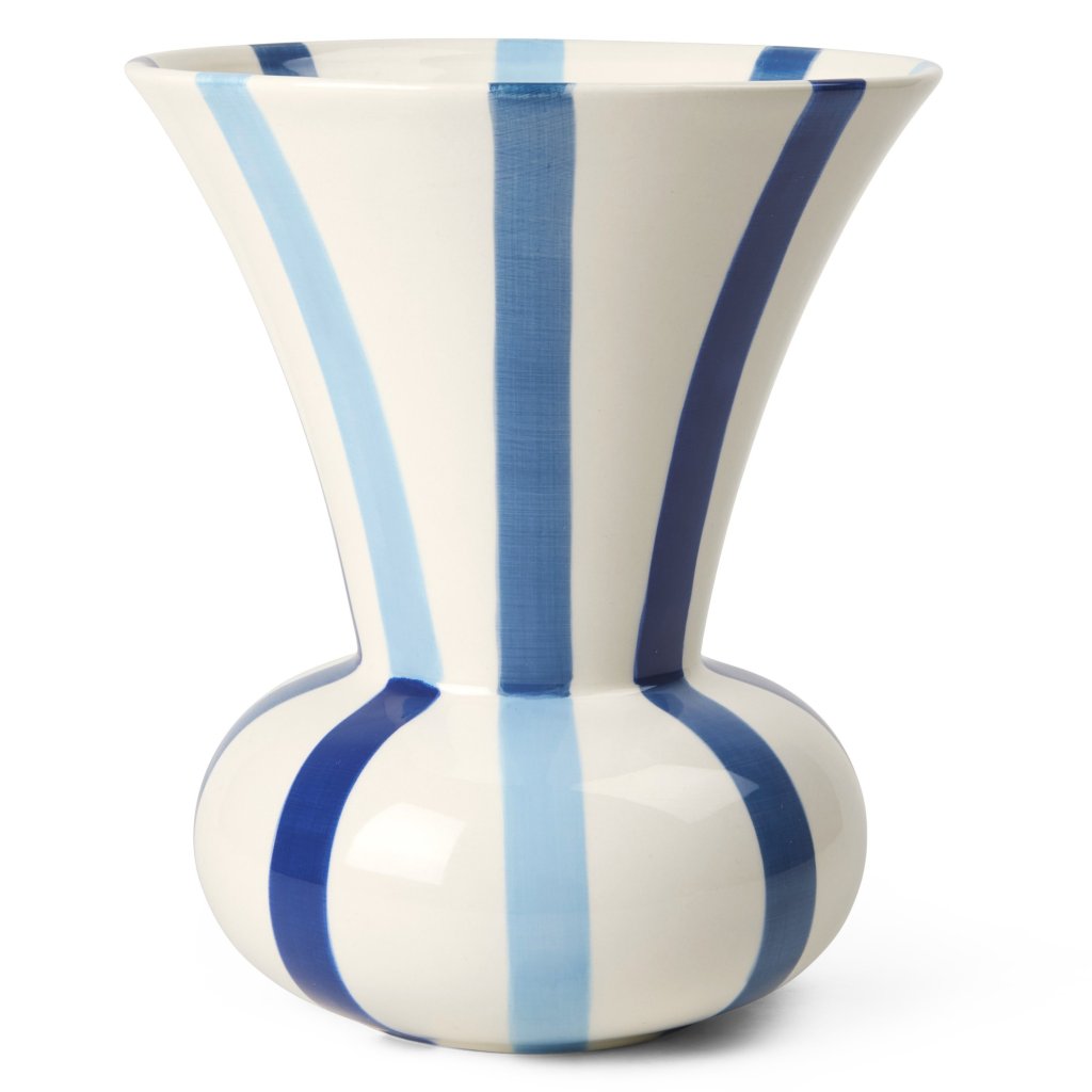 - projekt wazon SIGNATURE o wysokości 20 cm to oryginalny element ceramiczny, który wyróżnia się ręcznie malowanymi niebieskimi paskami