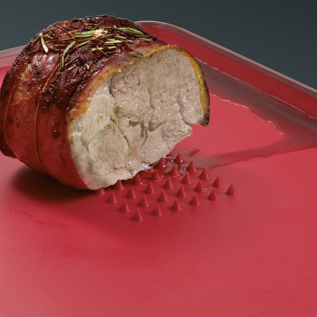 Widelec do mięsa często służy jako pomoc przy krojeniu pieczeni. Soczyste mięso ma tendencję do ślizgania się po desce do krojenia i wymaga stabilizacji. Dwustronna deska do krojenia Cut&Carve jest wyposażona w wypukłości po jednej stronie, na których można umieścić pieczeń i dzięki temu mieć znacznie większą kontrolę nad krojeniem. Podwyższona krawędź wyłapuje wyciekającą ciecz, którą można dodatkowo wykorzystać dzięki zaokrąglonym narożnikom służącym do odlewania nadmiaru płynów. Druga strona deski jest gładka.