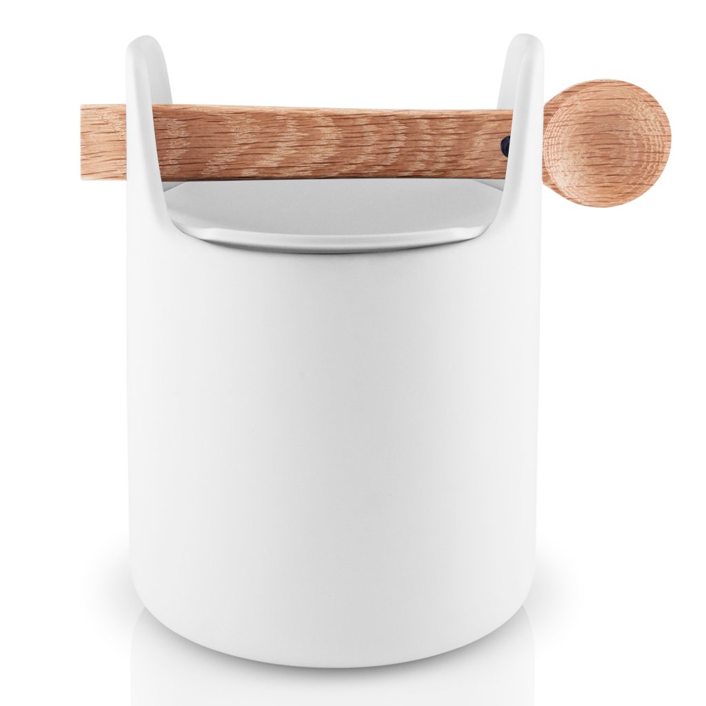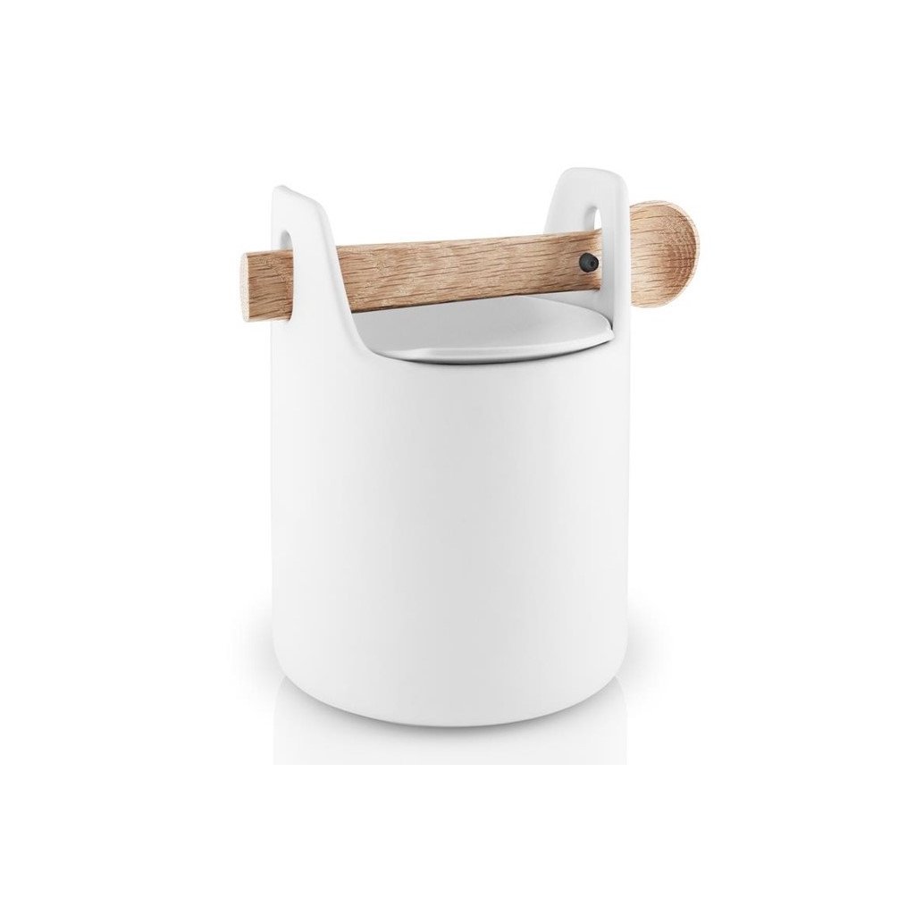 Ceramiczny wielofunkcyjny pojemnik na żywność Eva Solo łączy w sobie modny biały kolor z łyżką z jasnego drewna dębowego, która dodaje całości ciepłego tonu i służy również jako uchwyt. Zastosowano w nim prosty, charakterystyczny design o wysokim stopniu funkcjonalności. Dodatkowo pojemnik wyposażony jest w hermetyczną pokrywę.