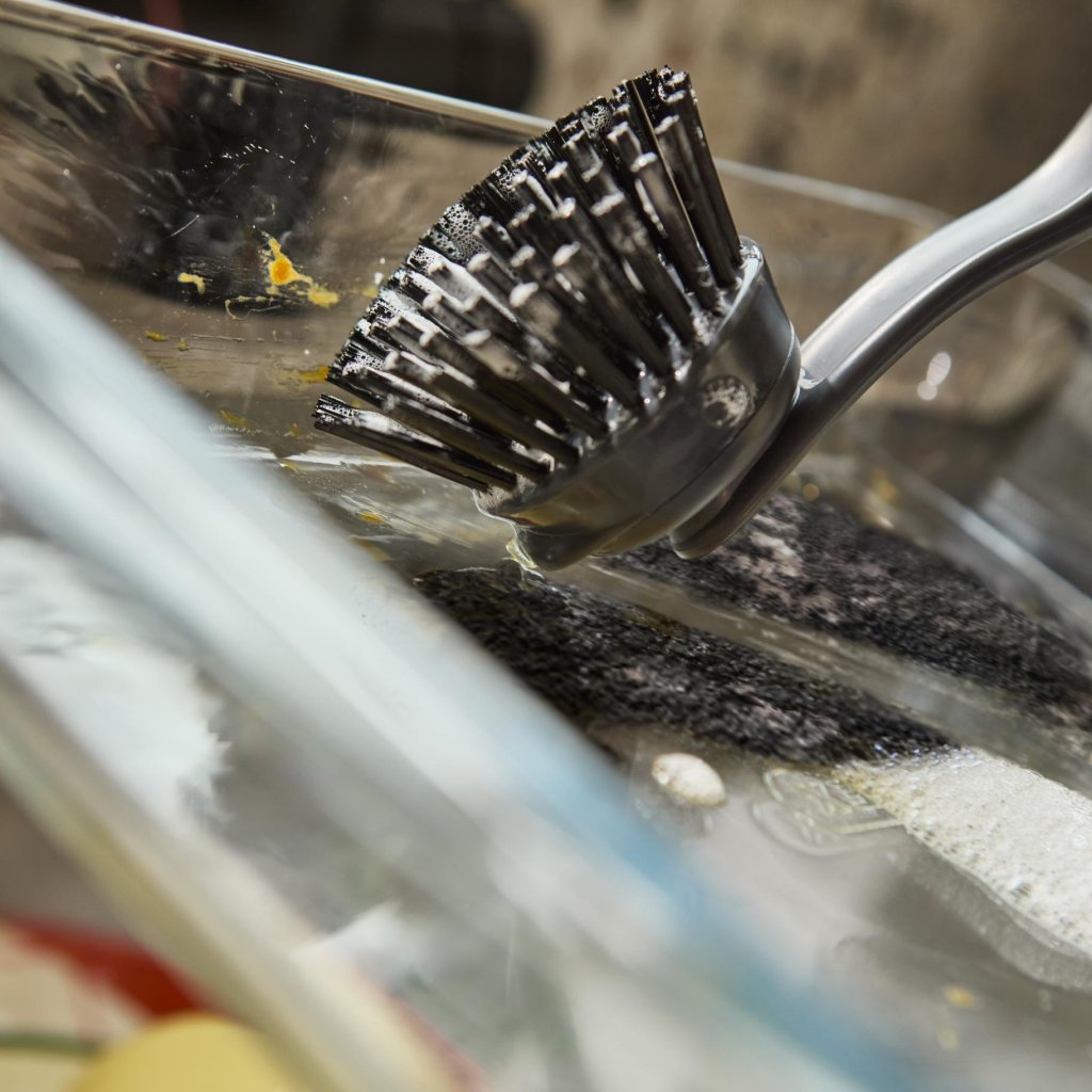 - Gęste włosie pomaga skutecznie usuwać resztki jedzenia z talerzy, garnków i innych naczyń kuchennych.