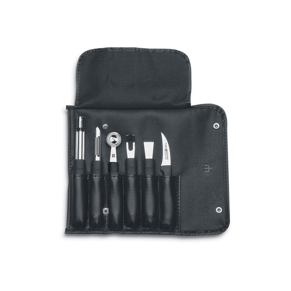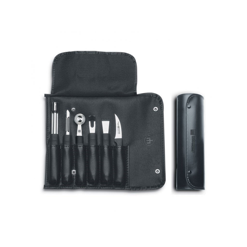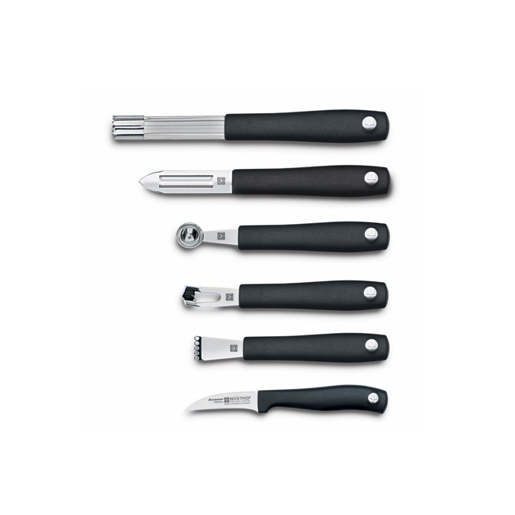 Zestaw do kreatywnego rzeźbienia w owocach i warzywach niemieckiej marki WÜSTHOF zawiera profesjonalne narzędzia do przygotowywania dekoracji talerzy. Narzędzia są przechowywane w czarnym zwijanym etui. Narzędzia wykonane są z wysokiej jakości stali nierdzewnej z uchwytami z tworzywa sztucznego.