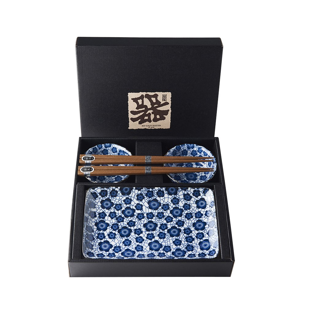 Talerze i miski są białe ozdobione niebieskimi kwiatami. Użyj zestawu do serwowania sushi z sosami, ale możesz również użyć miseczek do sake. Ten zestaw jest dostarczany w czarnym pudełku prezentowym, dlatego nadaje się na prezent.