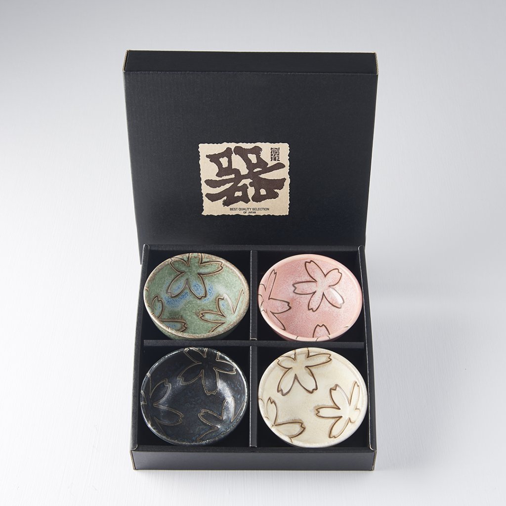 Zestaw zawiera 4 miski w kolorze zielonym, różowym, niebieskim i czarnym z wzorami kwiatowymi. Ten zestaw zapakowany jest w eleganckie czarne pudełko prezentowe, dlatego nadaje się na podarunek dla przyjaciół lub współpracowników biznesowych.