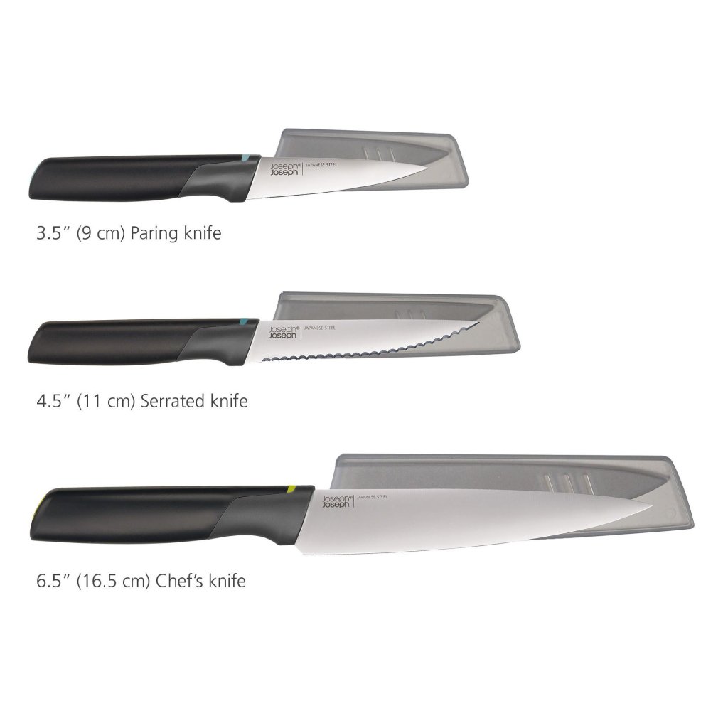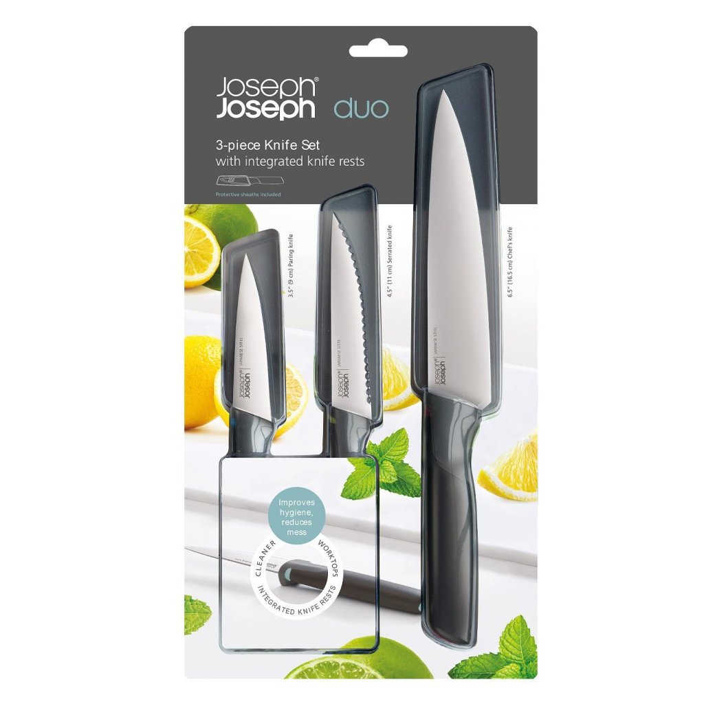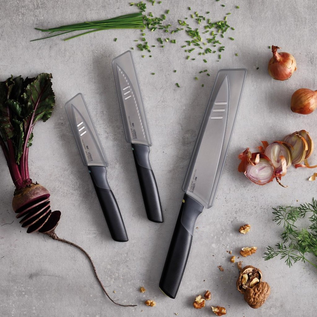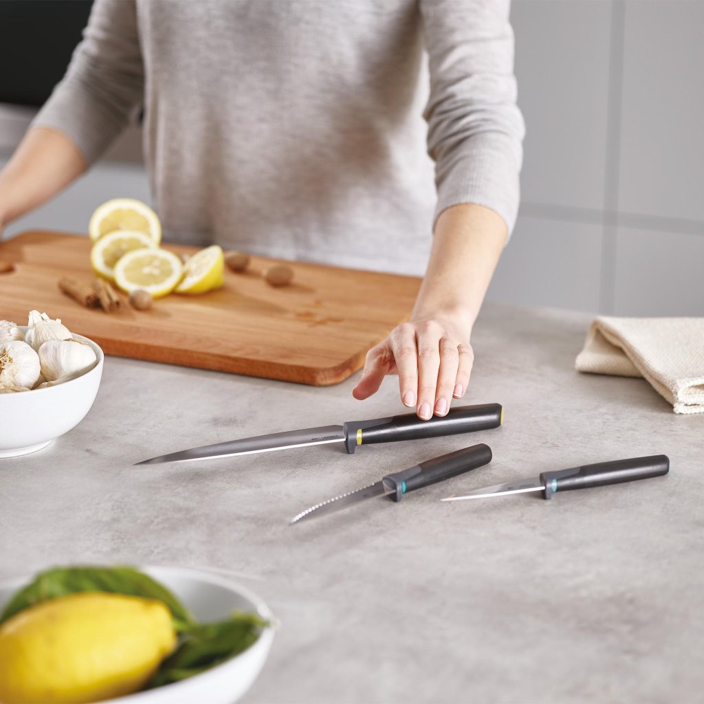 - Zestaw noży kuchennych Joseph Joseph ELEVATE OPAL zawiera 3 praktyczne noże przeznaczone do codziennej pracy w kuchni, od krojenia warzyw po przygotowywanie mięsa.