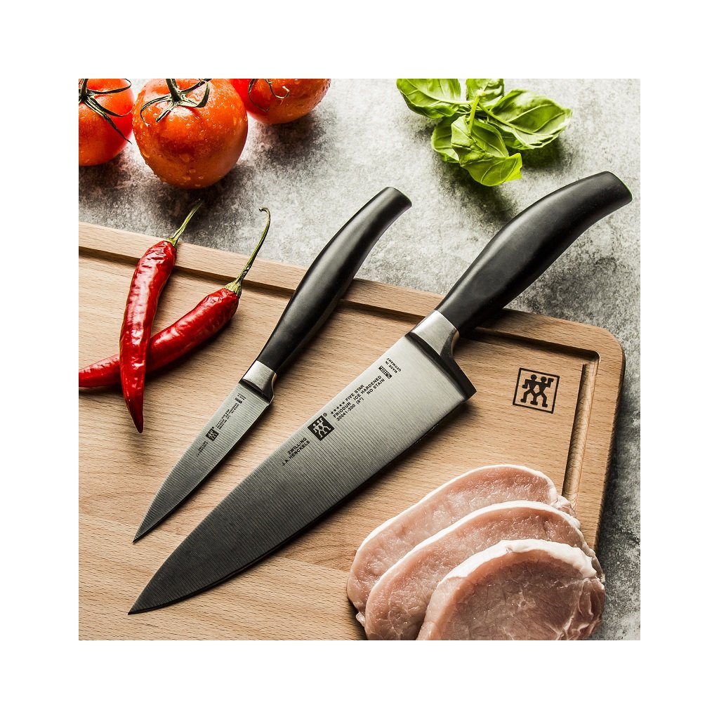 Zestaw 3 noży, ostrzałki i nożyczek z serii Zwilling Five Star, umieszczonych w praktycznym bloku. Specjalna mieszanka najlepszej niemieckiej stali z optymalnym stosunkiem chromu i węgla gwarantuje najlepsze właściwości. Noże są wykuwane z jednego kawałka stali w technologii Sigmaforge® i hartowane w technologii Friodur®, która polega na hartowaniu w stanie zamrożenia. Dzięki temu noże są twardsze i bardziej odporne na korozję.