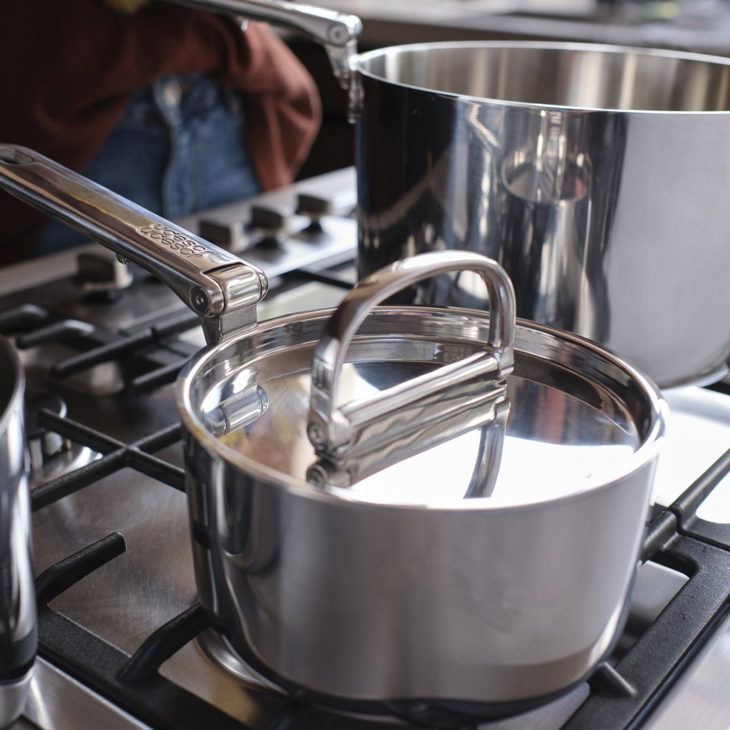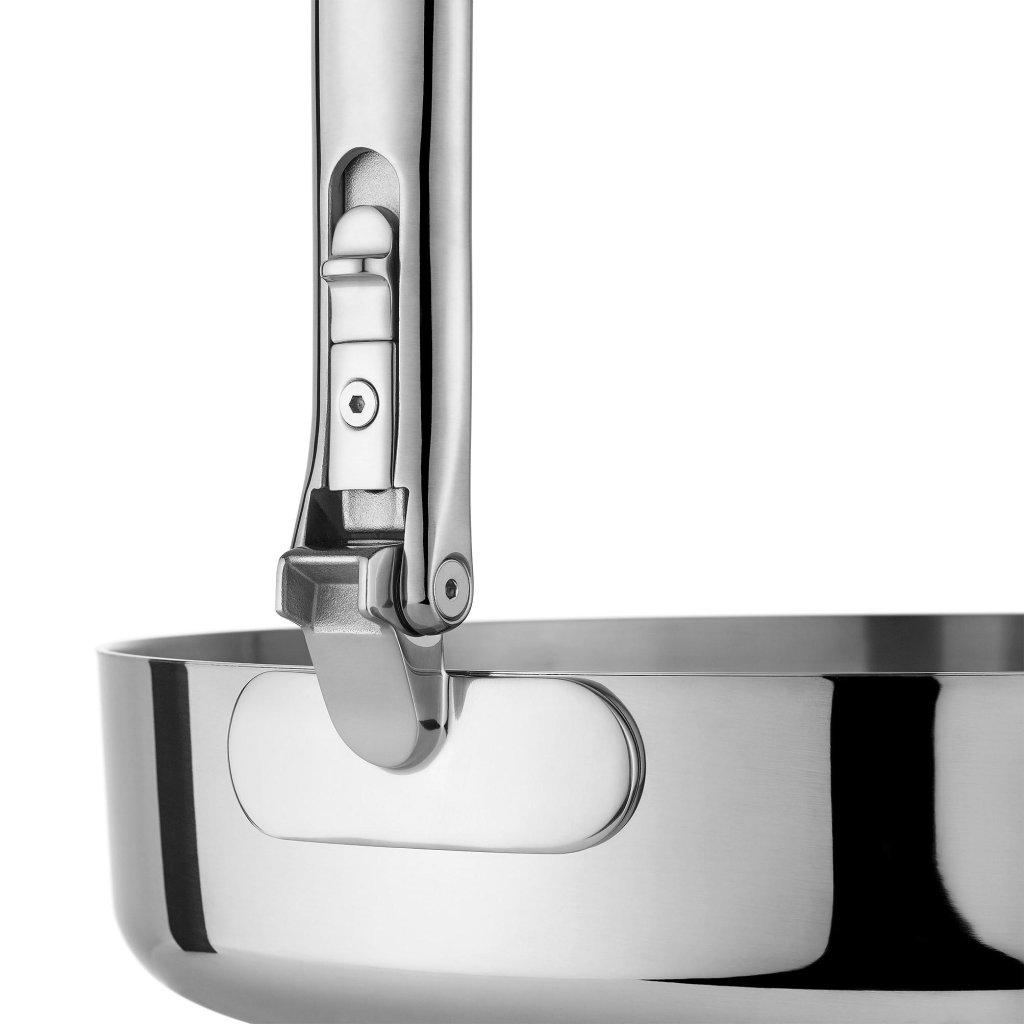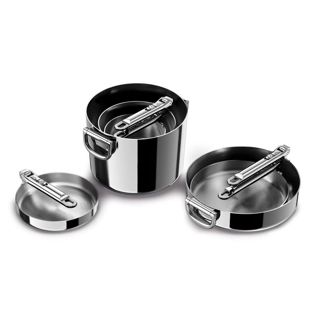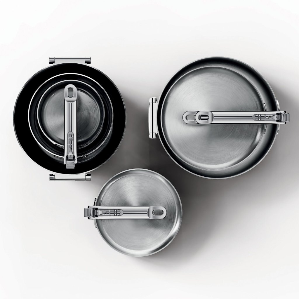 - Kompaktowa, modułowa konstrukcja umożliwia wsuwanie poszczególnych garnków i patelni jeden w drugi, podczas gdy składane uchwyty znacznie zmniejszają zapotrzebowanie na miejsce do przechowywania nawet o 50%.