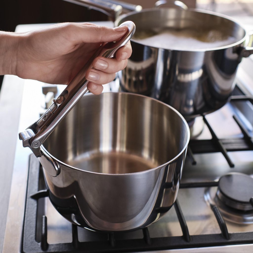 - Duże boczne uchwyty ze stali nierdzewnej w większych naczyniach są również składane, co ułatwia bezpieczne przenoszenie obiema rękami nawet przy pełnym obciążeniu.