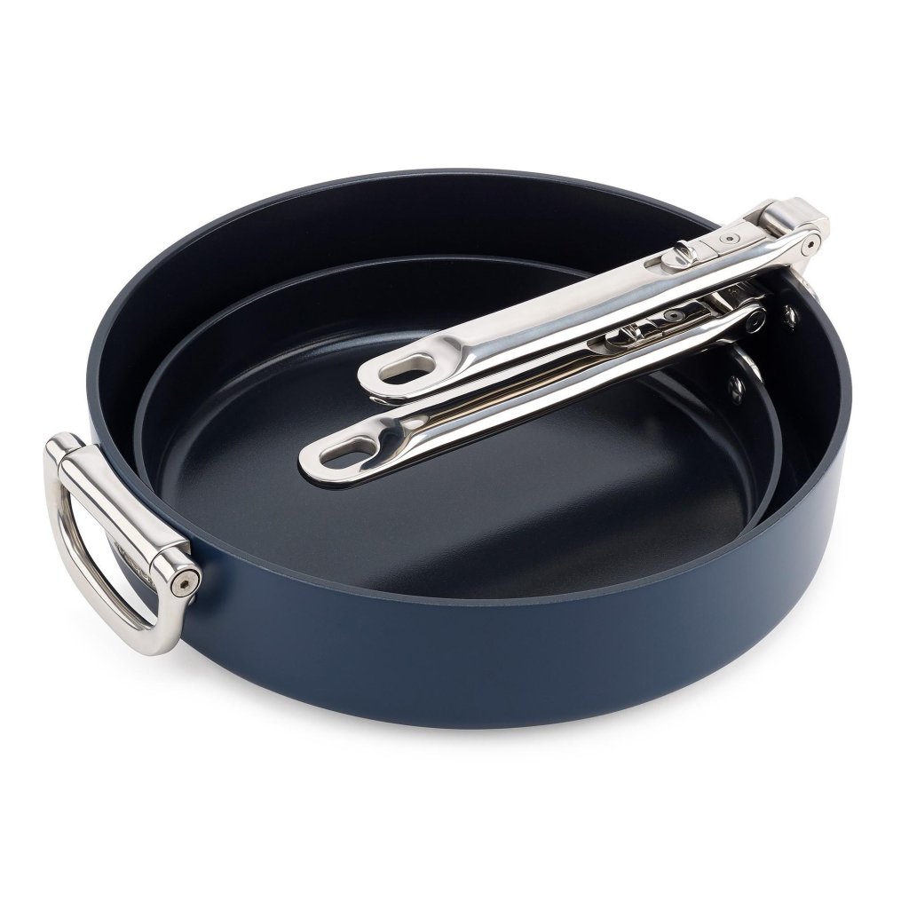 - Innowacyjna konstrukcja umożliwia złożenie uchwytów, dzięki czemu można zaoszczędzić do 50% miejsca w porównaniu do zwykłych patelni podczas przechowywania w szufladach lub szafkach.