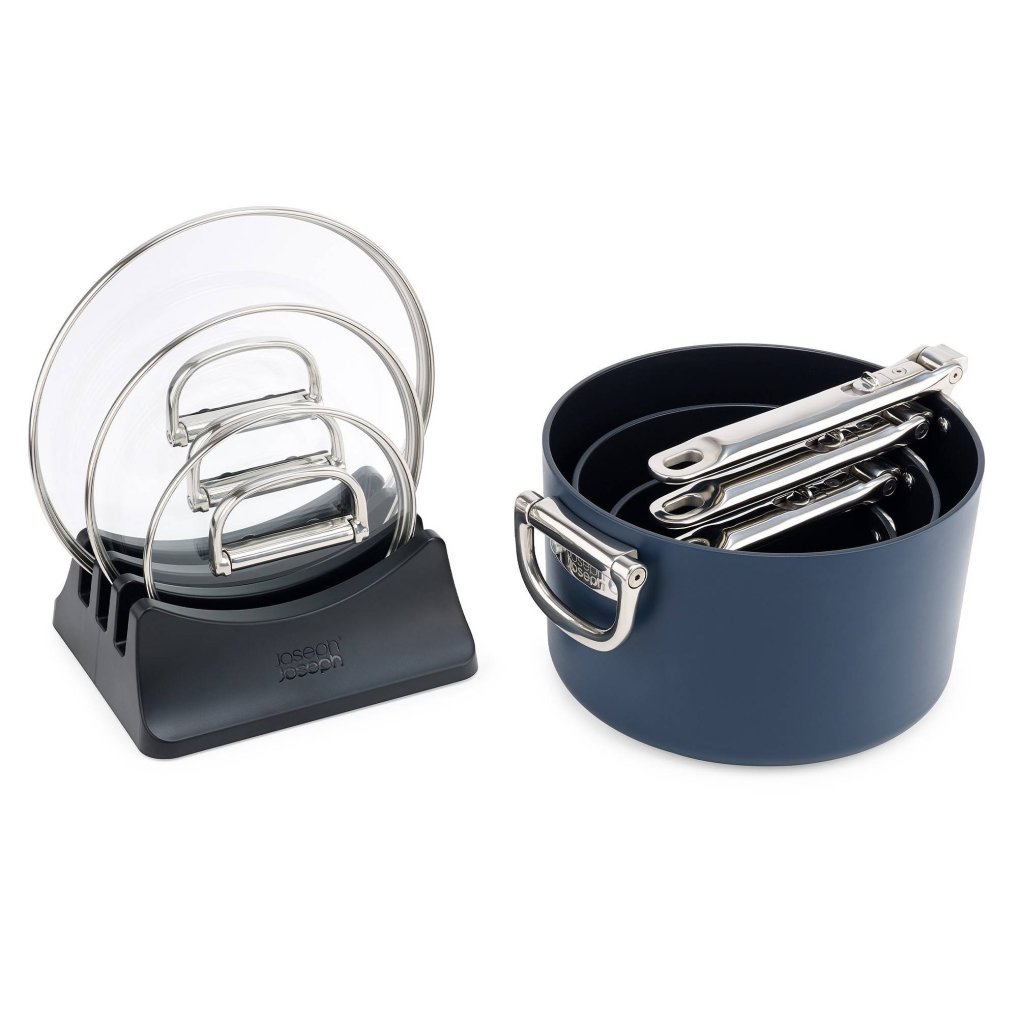 - W zestawie znajduje się stojak na trzy pokrywka do garnka, który umożliwia ich przejrzyste i kompaktowe przechowywanie w szafce kuchennej.
